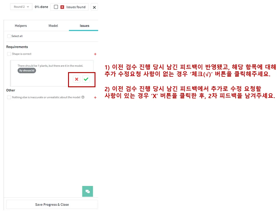 1) 이전 검수 진행 당시 남긴 피드백이 반영됐고, 해당 항목에 대해 추가적으로 수정 요청 사항이 없는 경우 초록색 '체크' 버튼을 클릭해주세요.