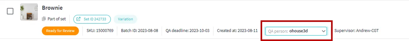 4) 주문 목록으로 돌아가 선택박스를 통해서 QA person을 ohouse3d로 설정해주세요. (파트너사에서 1차 검수를 마친 상품에 대해서 오늘의집 담당자가 2차 검수를 진행할 예정입니다.)