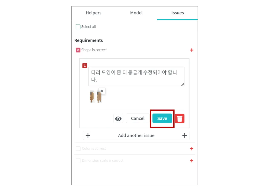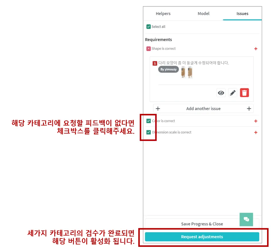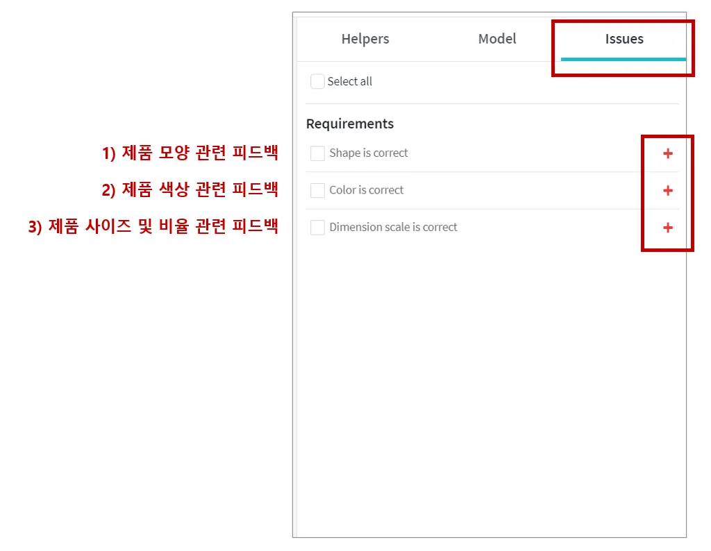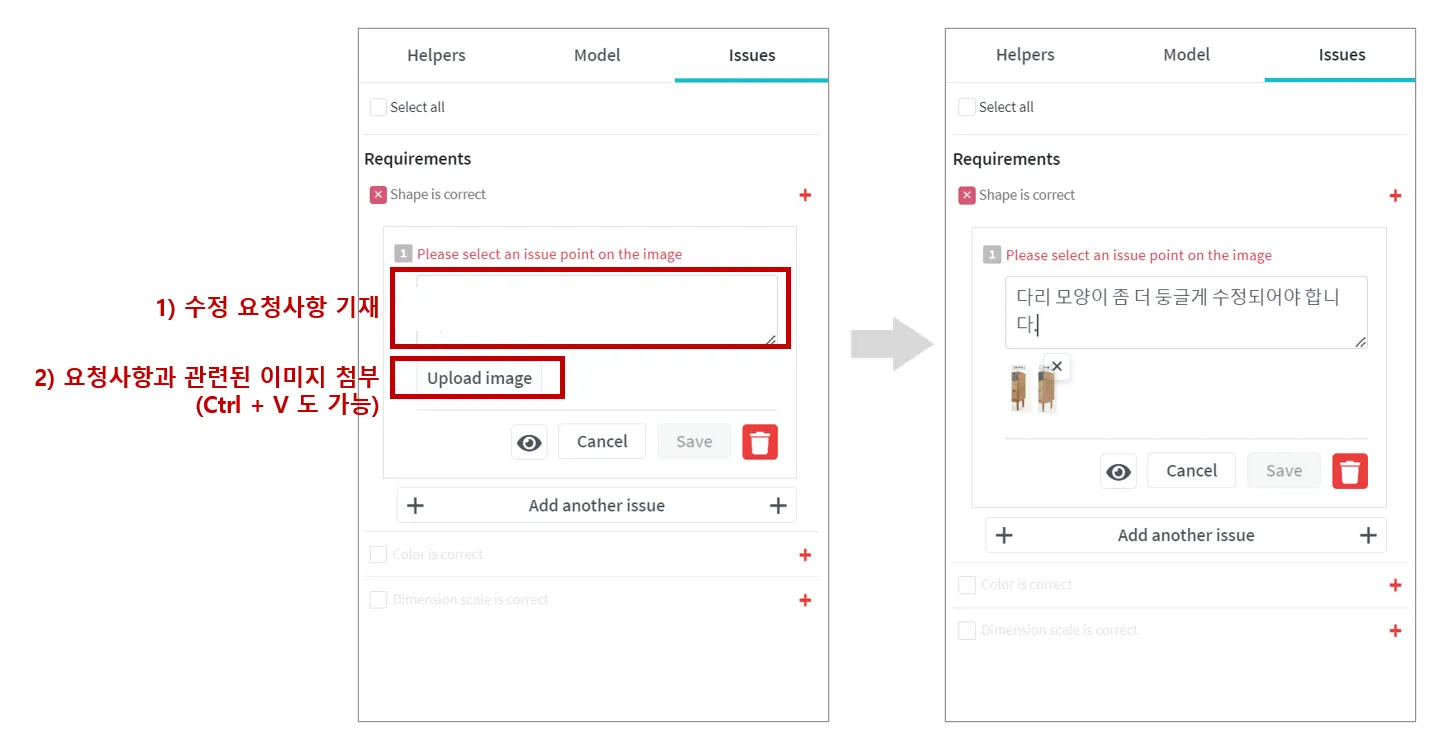 2) 해당 카테고리 수정 요청사항 입력 후 참고 이미지를 첨부해주세요. (3D 모델과 실제 제품을 나란히 놓고 수정 필요 부분을 정확히 마킹한 이미지 첨부를 권장드립니다.)