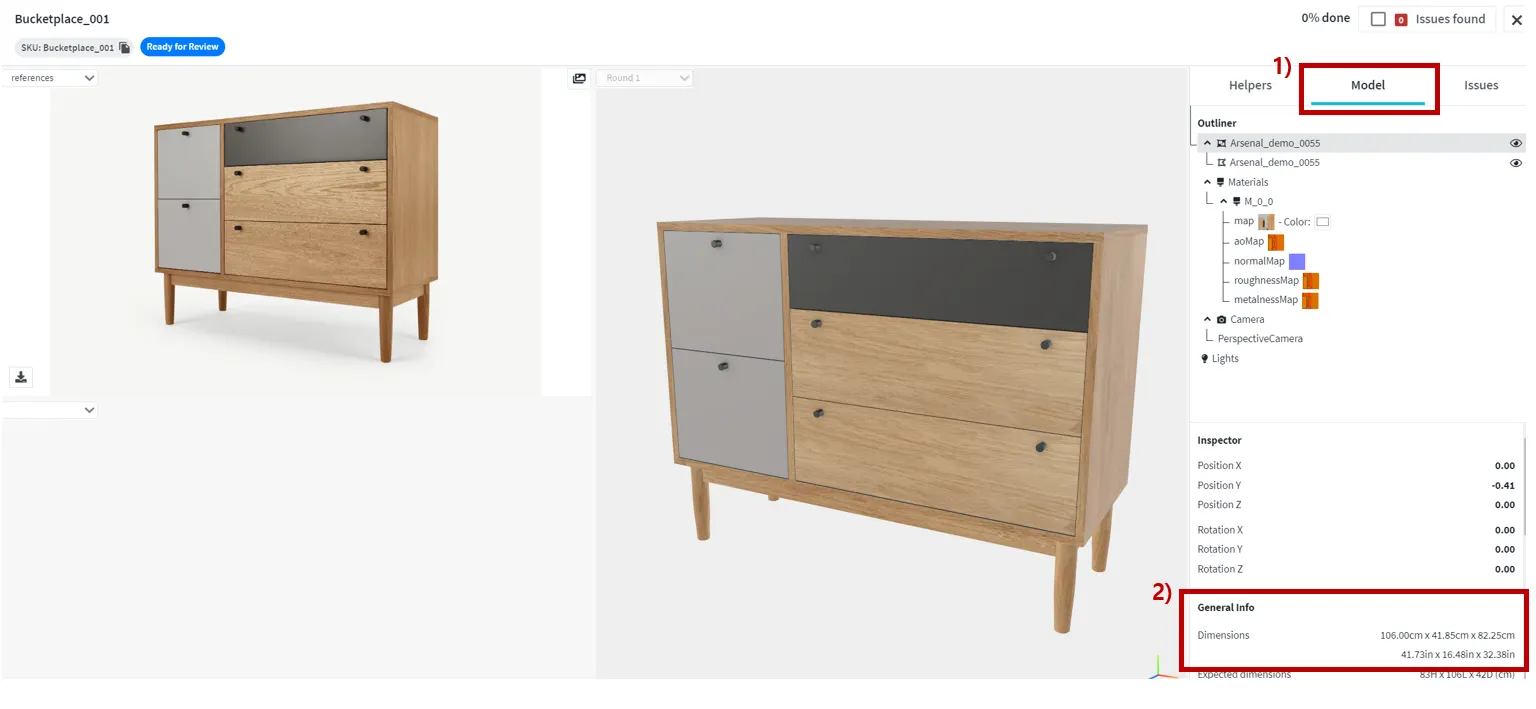 3D 모델 사이즈는 페이지 우측 상단에 있는 Model탭 클릭 - 하단 General Info > Dimensions에서 확인할 수 있습니다.