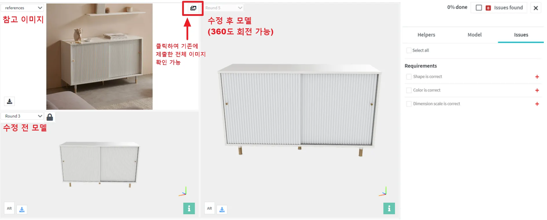3D 모델 뷰어는 3개 영역으로 구성되어 있습니다. 좌측 상단 참고 이미지 영역 내 그림 아이콘을 클릭하시면 기존에 제출한 전체 이미지를 확인하실 수 있습니다.