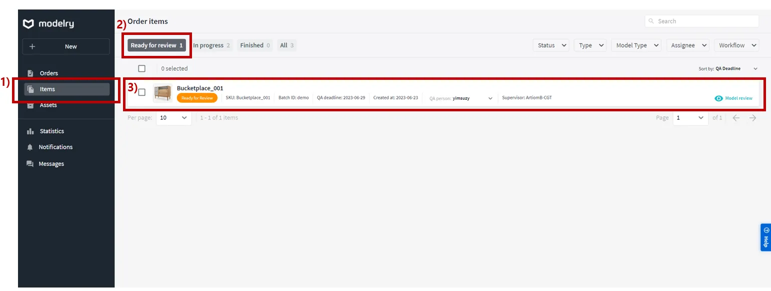 Workspace 로그인 - 1) Items 클릭 - 2) Ready for review 클릭 - 3) 검수 진행할 제품 선택해주세요.