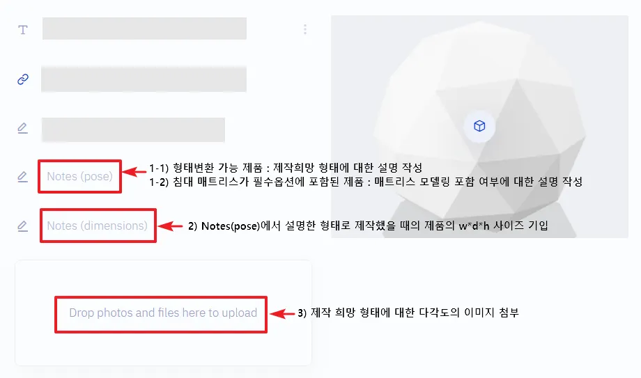 해당 형태에 대한 설명을 Notes(pose)란에 남겨주세요. (ex. “첨부 이미지와 같이 테이블 열림 형태로 제작해주세요.”)