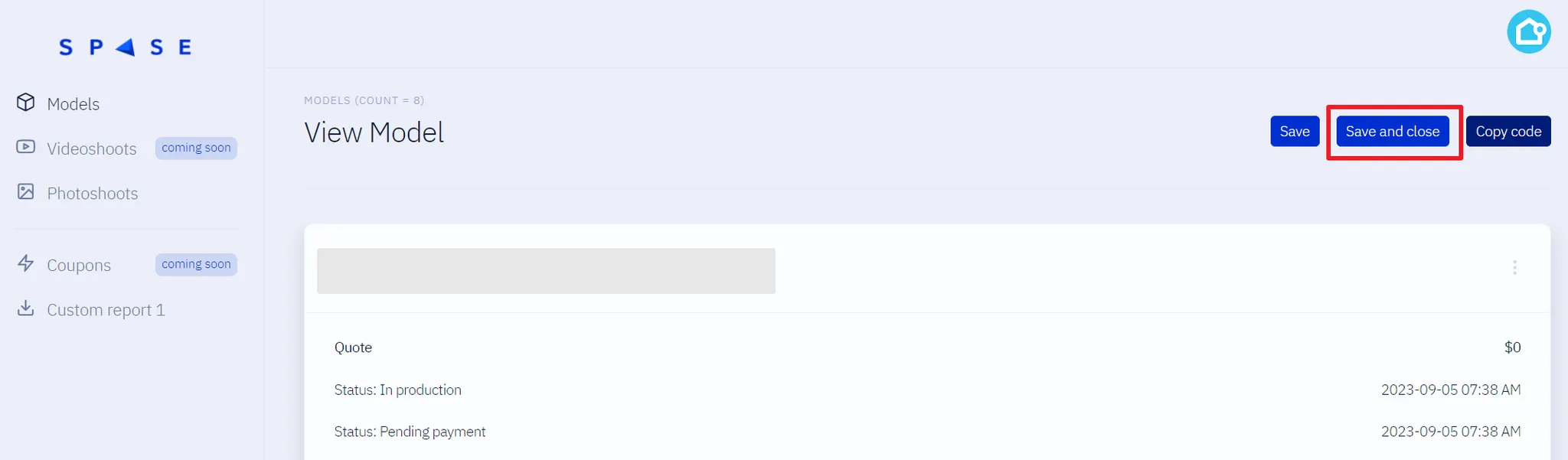 사이즈 정보 및 이미지 첨부가 완료되셨으면 페이지 우측 상단의 Save and close 버튼을 클릭하여 제출을 완료해주세요.